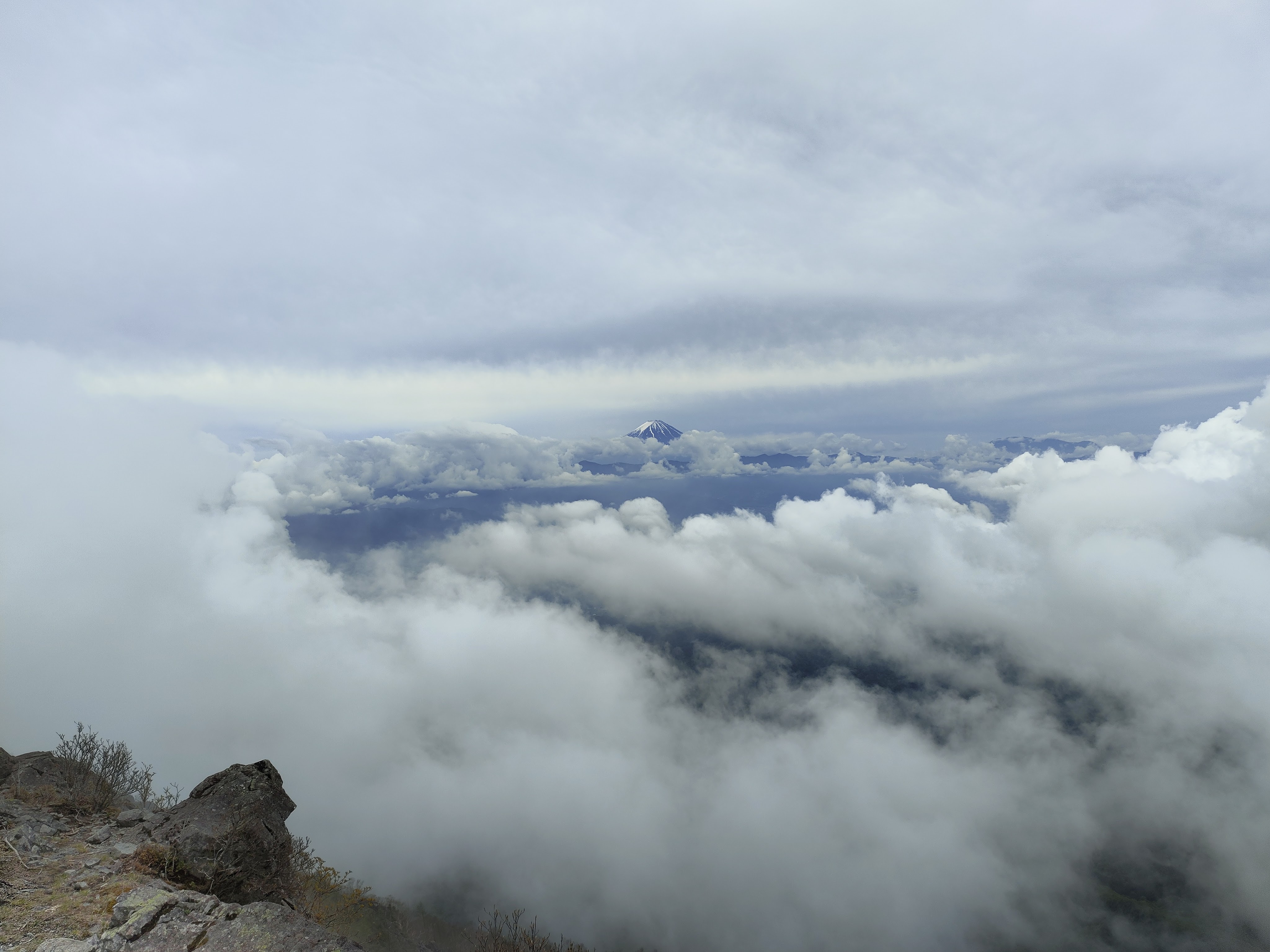 雲の合間、遠くに富士山が見えます。乾徳山からの富士山は本当に綺麗です。