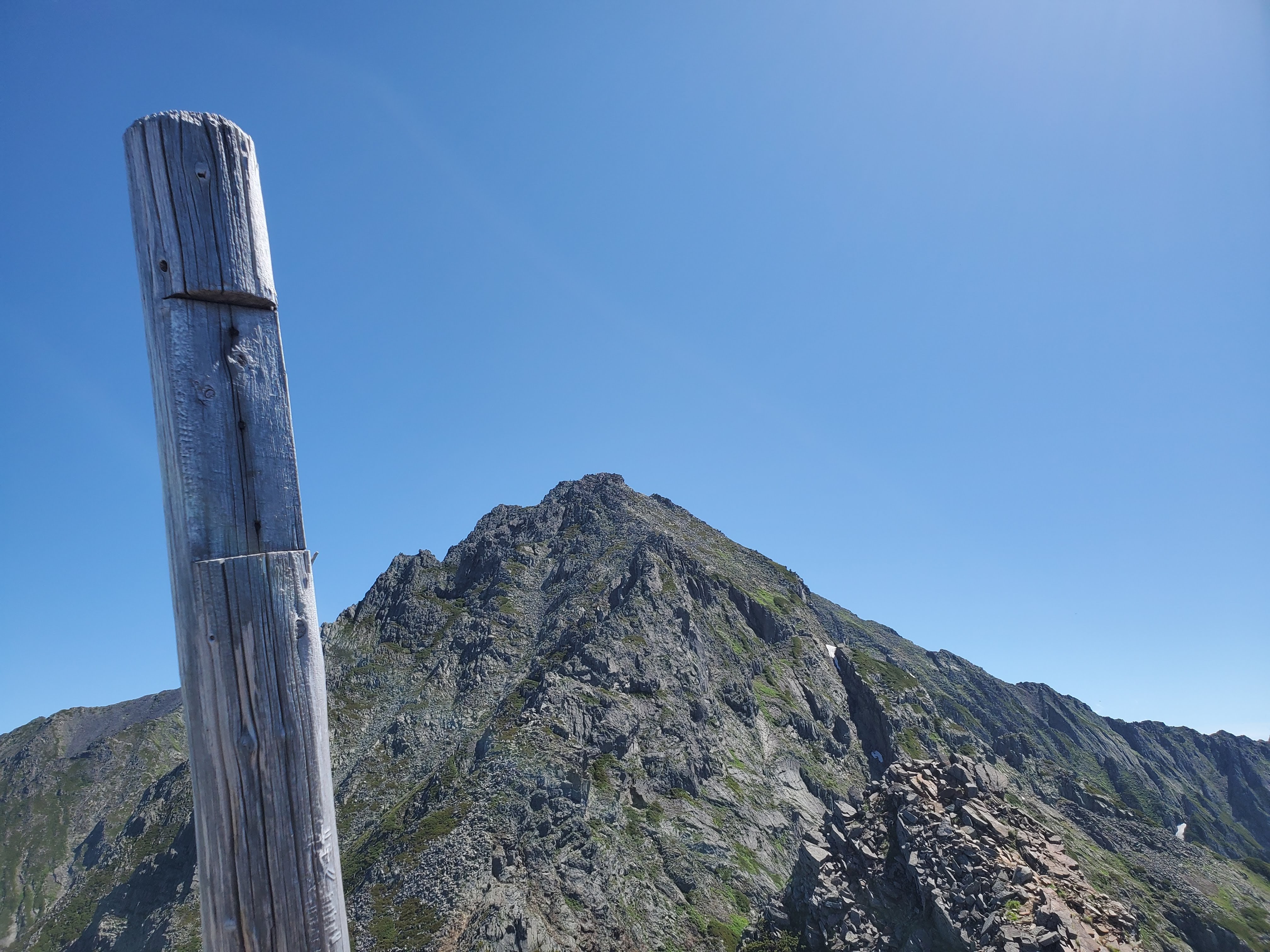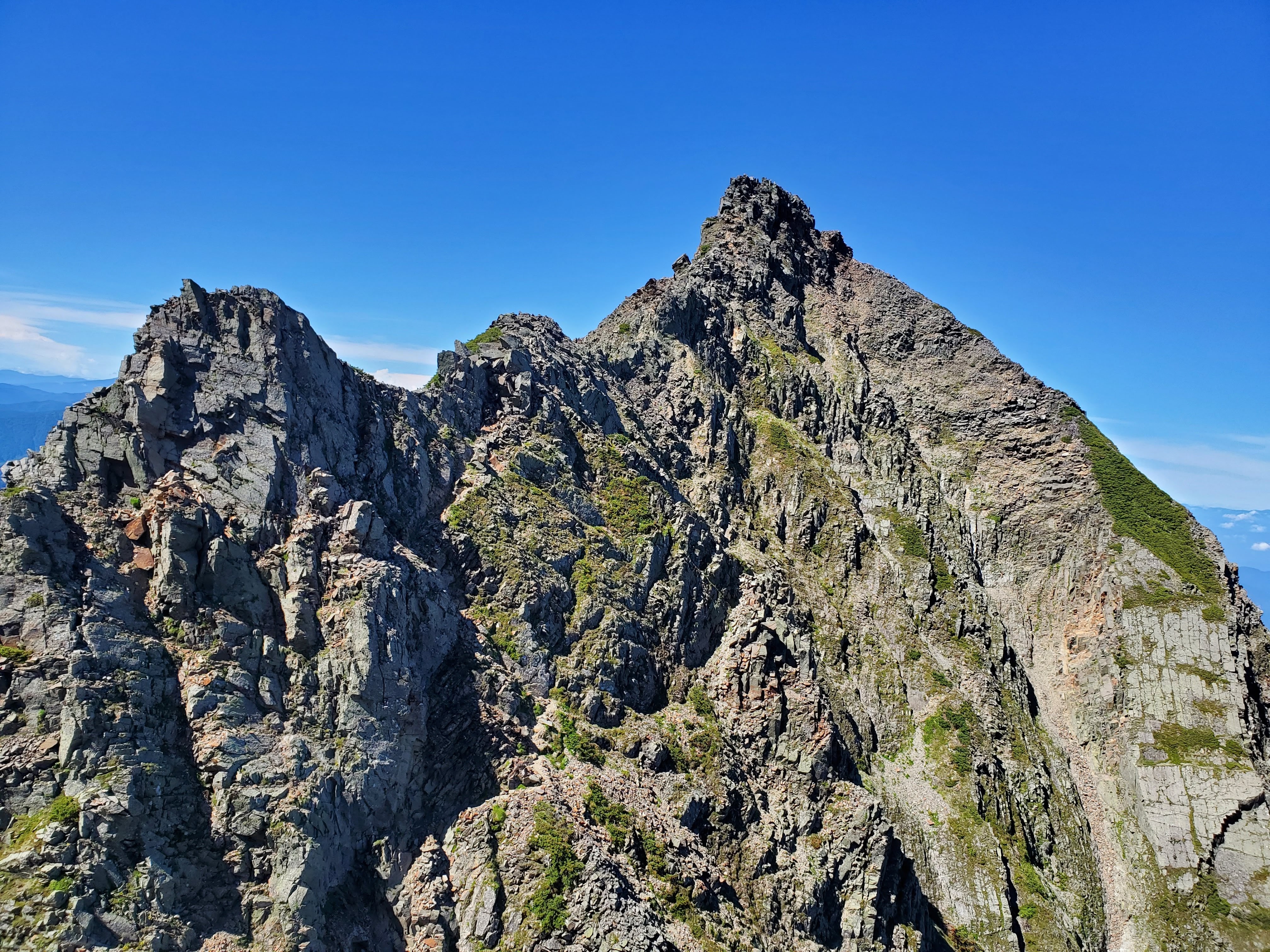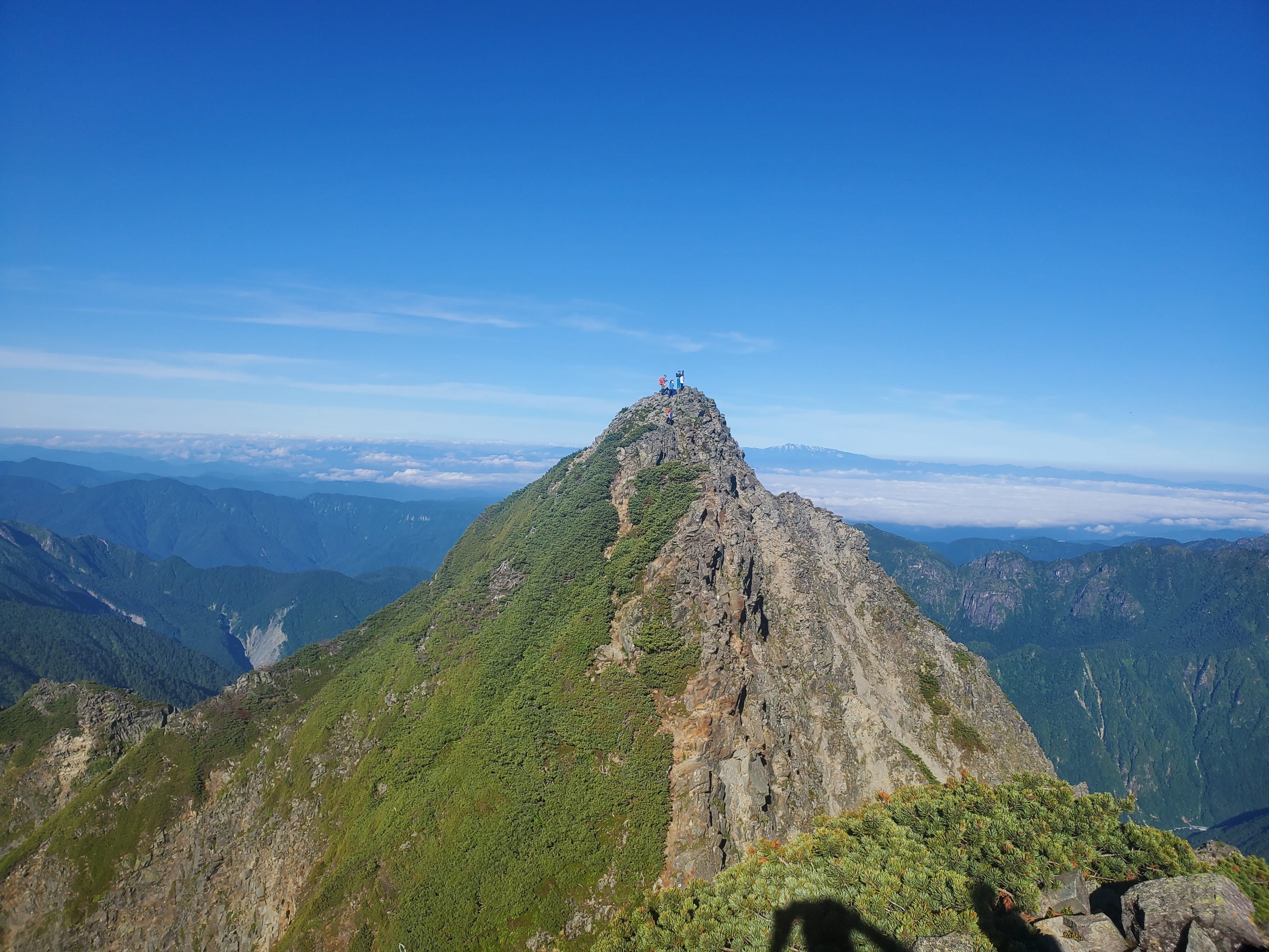 間ノ岳、天狗の頭を越えて、天狗のコルへ下降していきます。下降は、コル直前が一番難しい。