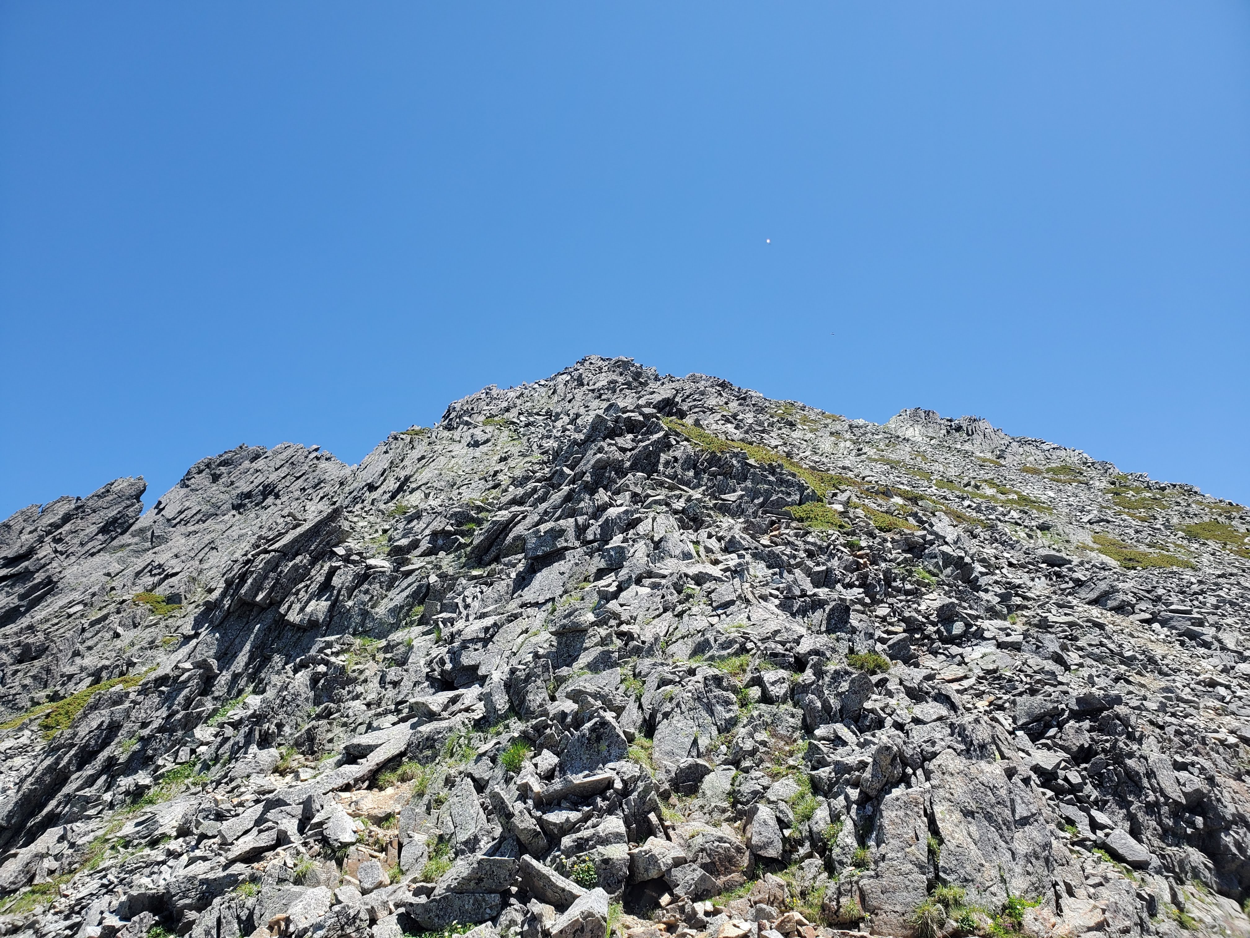 西穂高岳の頂上を越えると、稜線は厳しさを増していきます。浮石も多いので、3点確保を意識して慎重に。