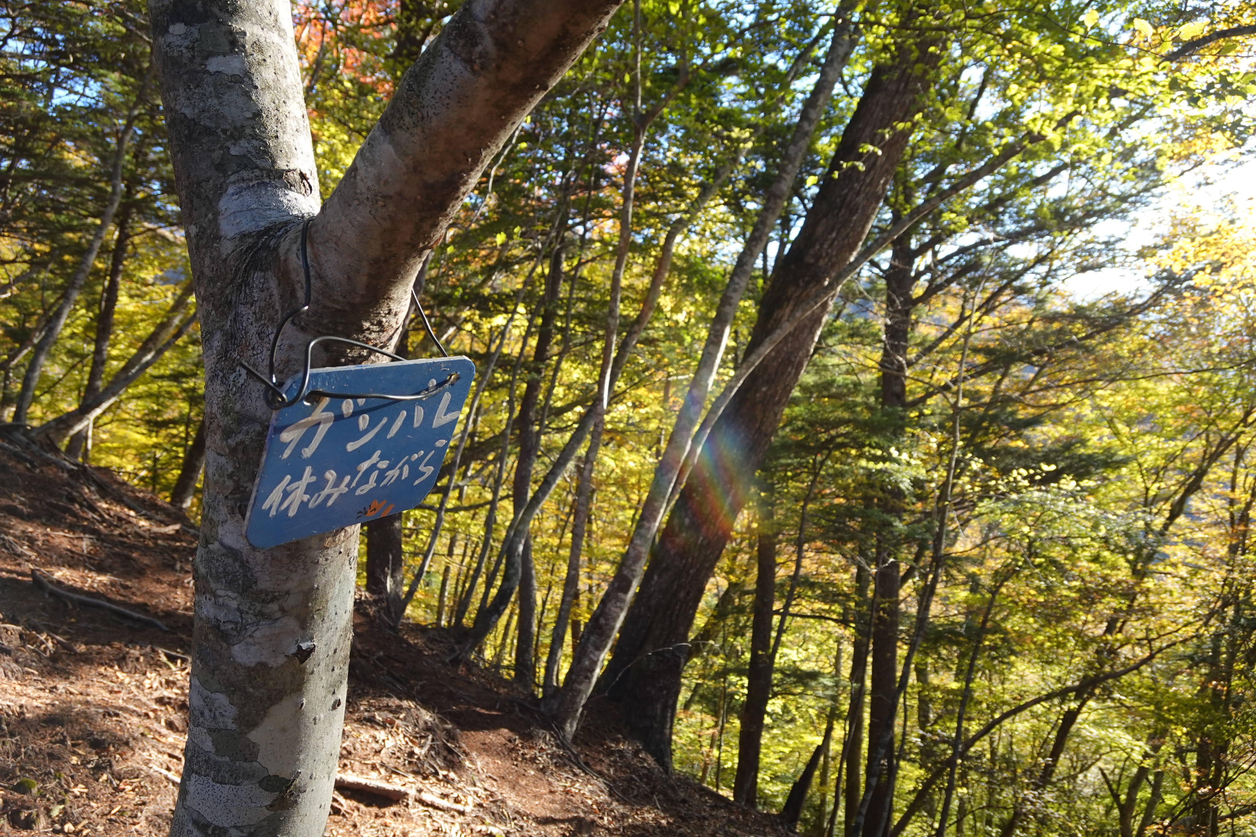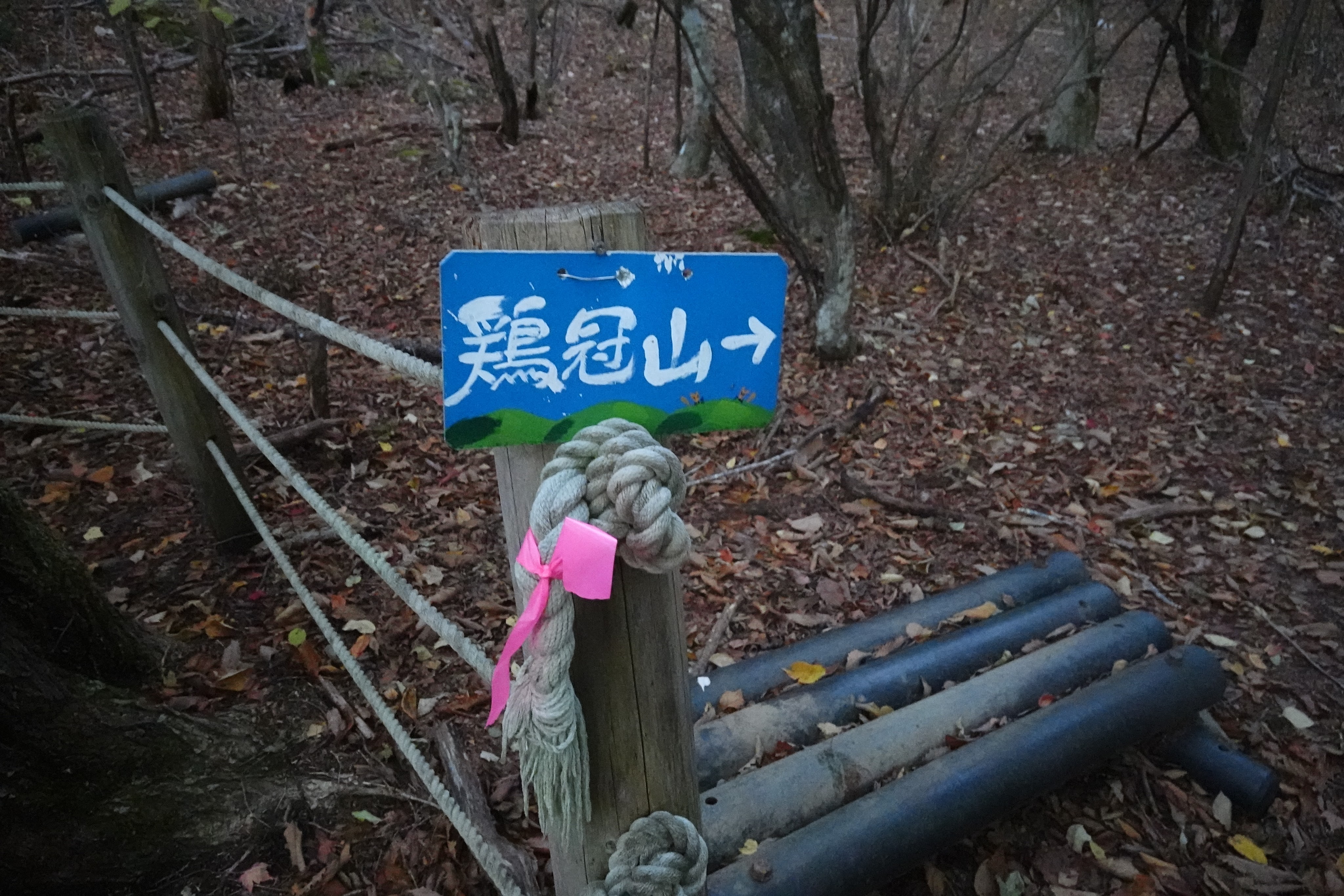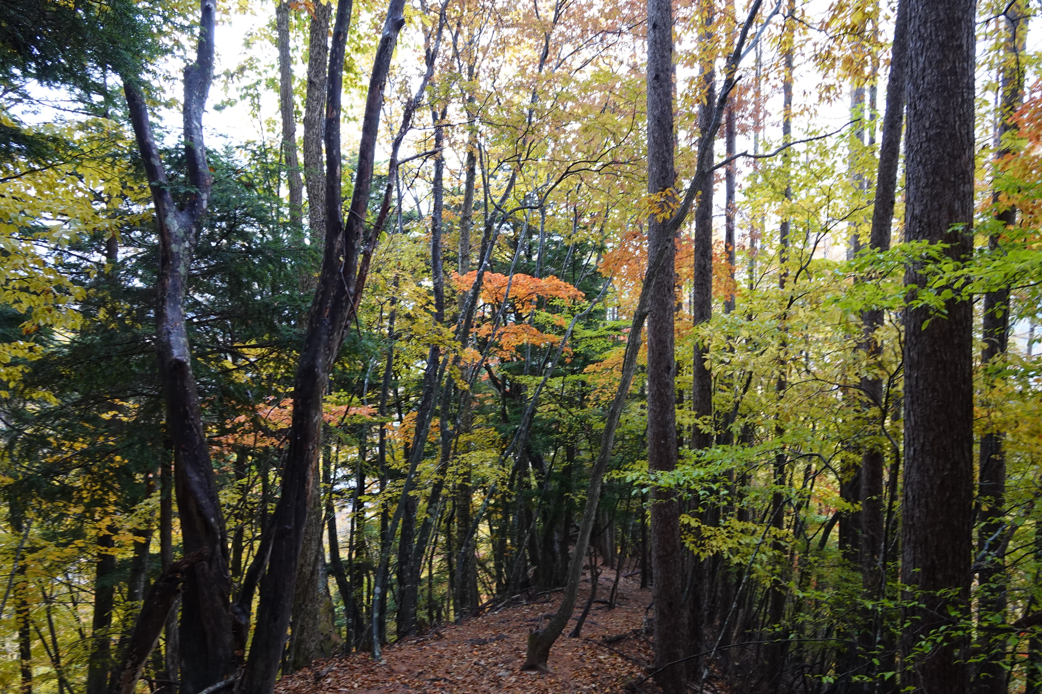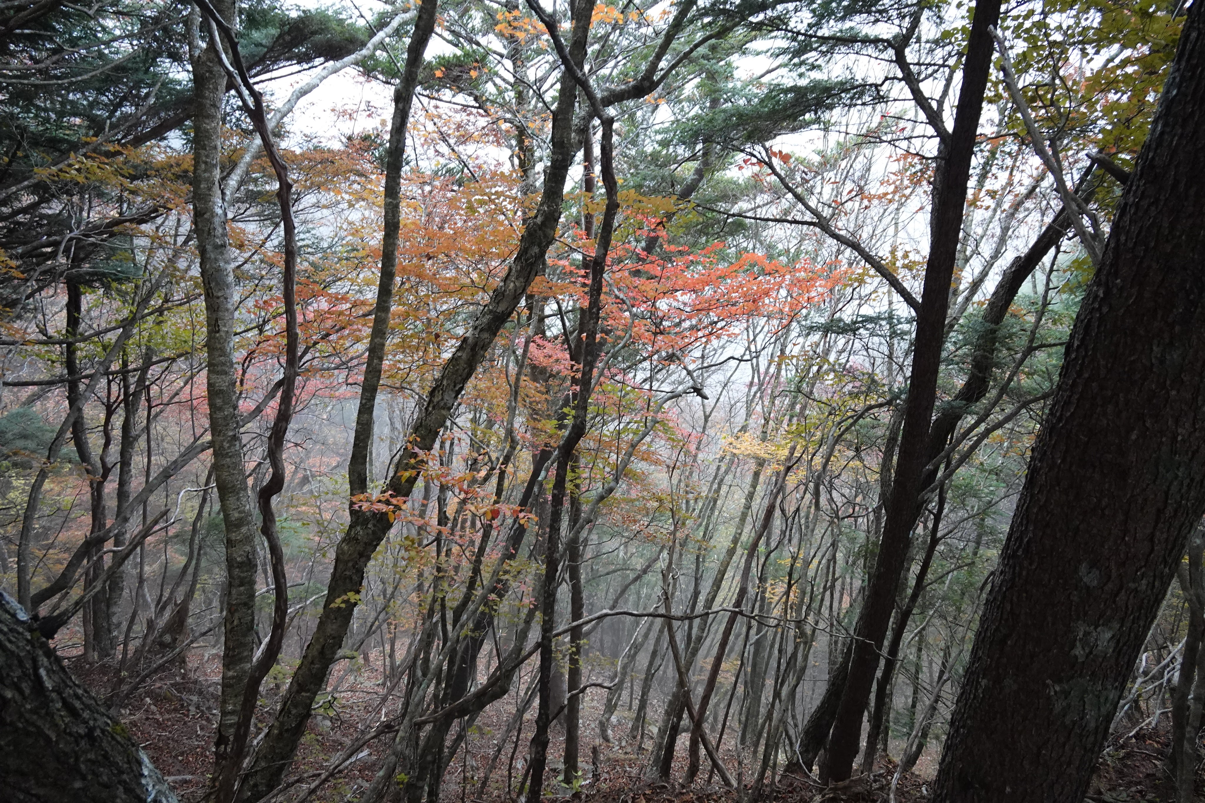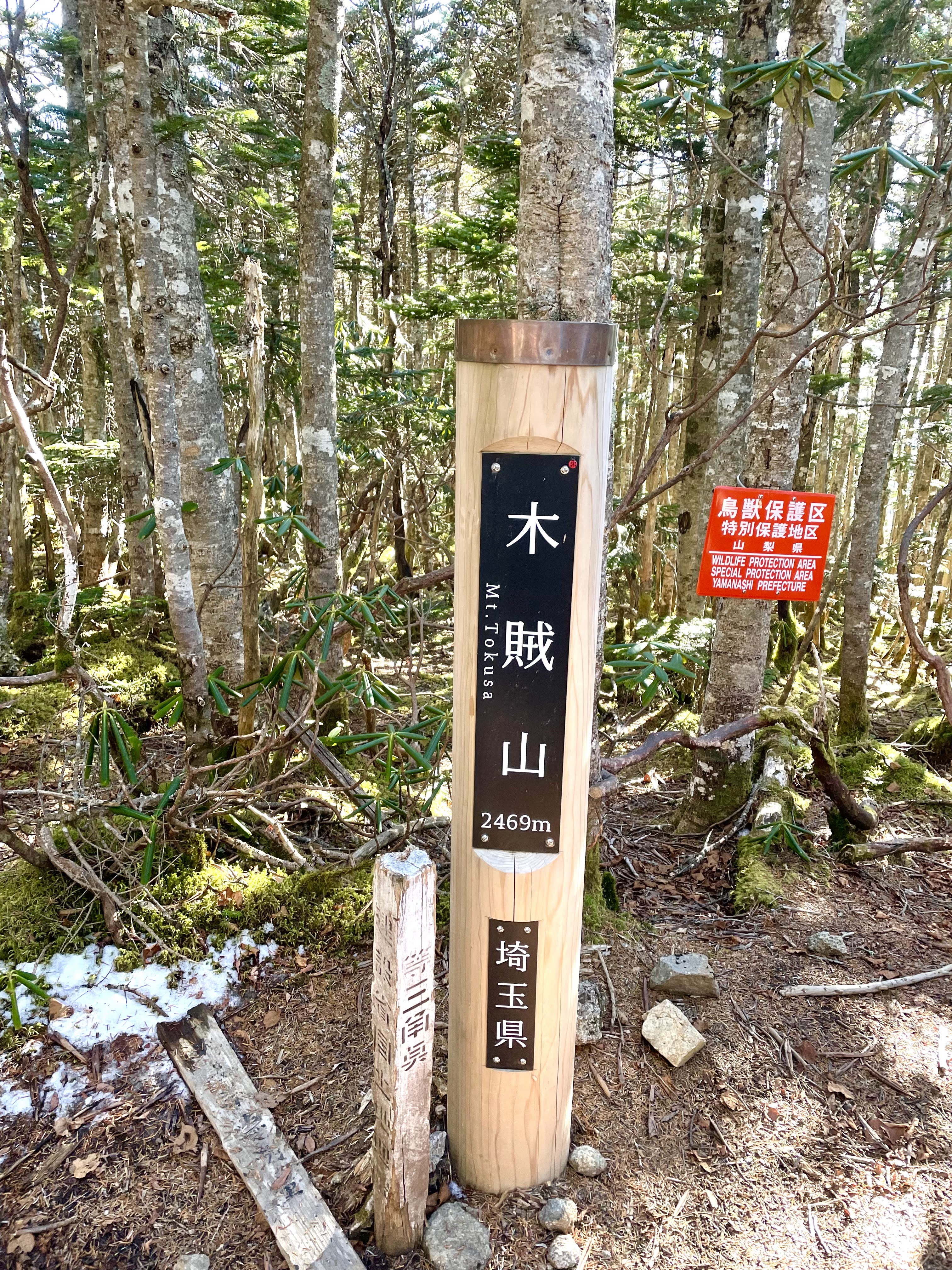 鶏冠山の岩峰群を過ぎると、再び樹林帯に突入し、バリエーションルートっぽい藪漕ぎなども出てきます。慎重にルートファインディングをしつつ進むと、木賊山の頂上へ。