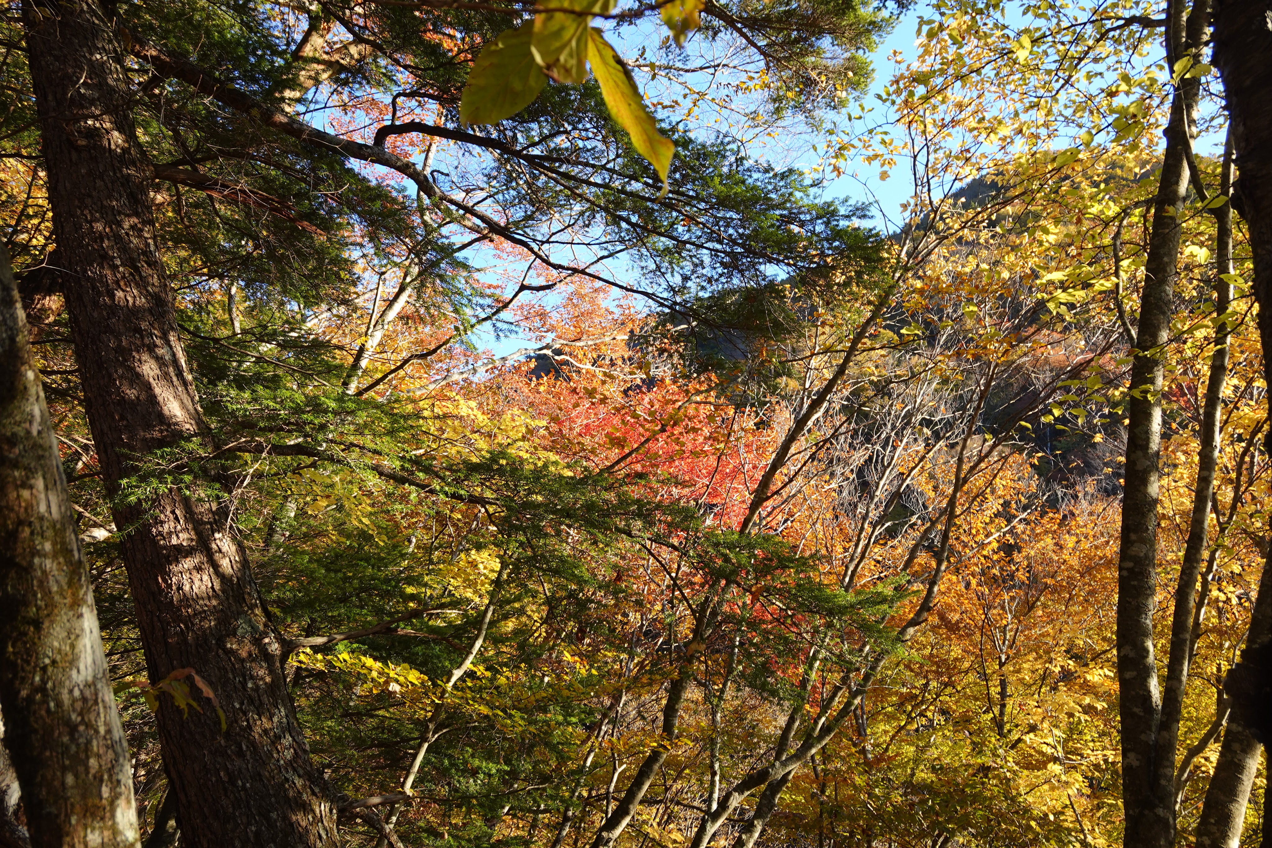 西沢渓谷は紅葉まっさかり。鶏冠尾根も、下りの徳ちゃん新道も、とても色鮮やかな紅葉でした。