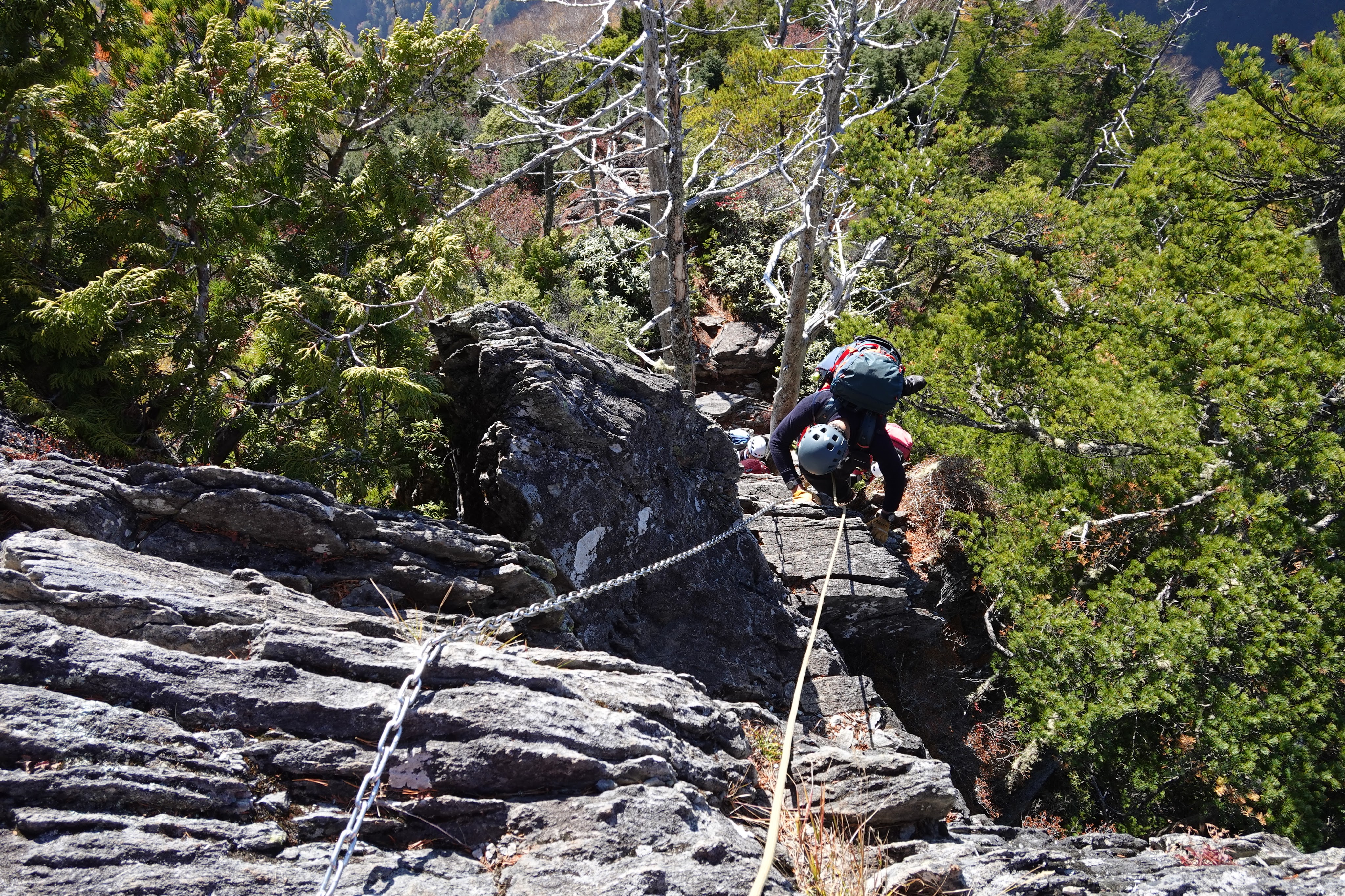 稜線に出ると一気に景色が開け、険しい岩場が始まります。チェーンはついてますが、アンザイレンして慎重にクライミング。