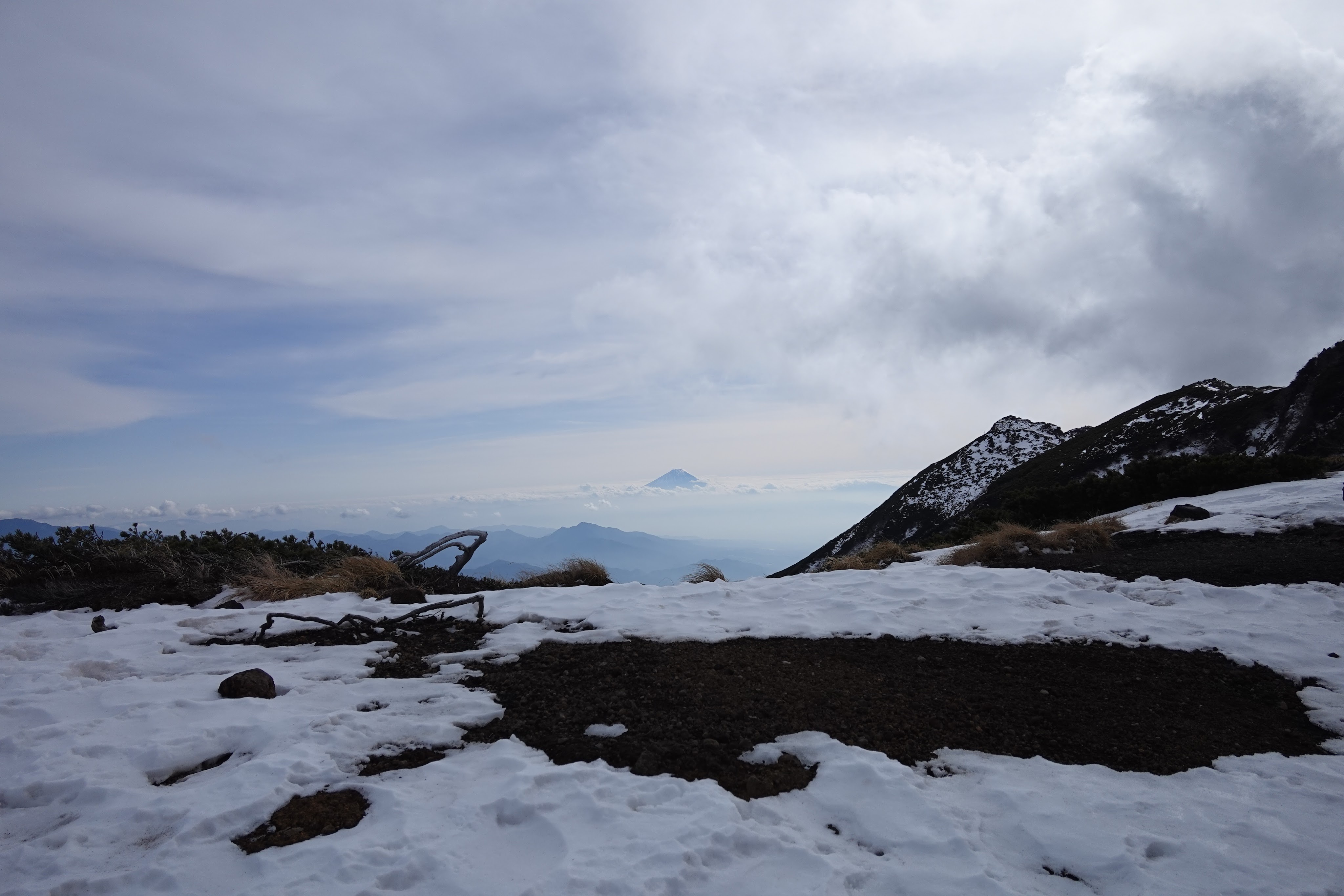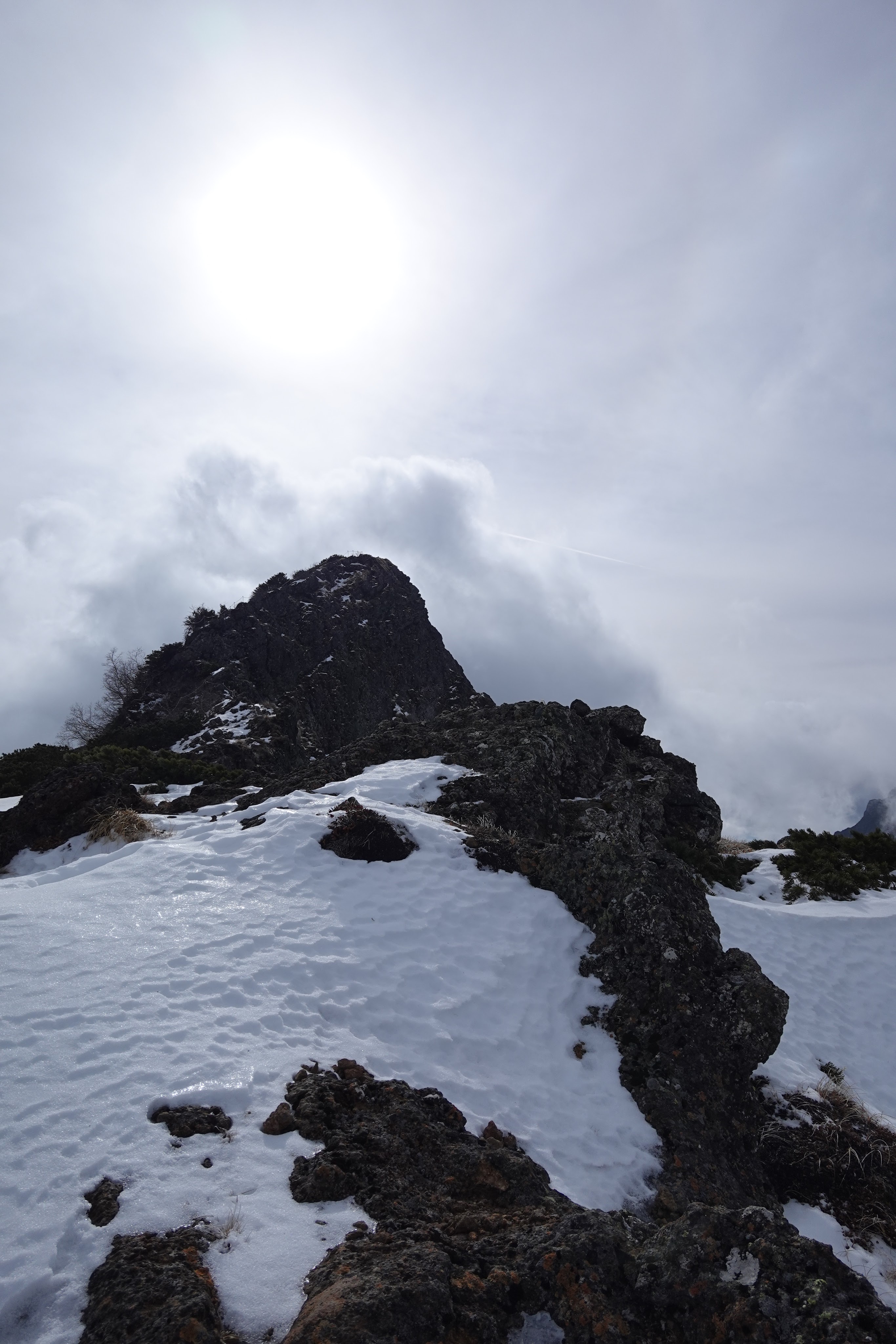 アプローチや登山道に少し雪はあったものの、チェーンスパイクでOK。ルート上はフラットソールで問題ありませんでした。