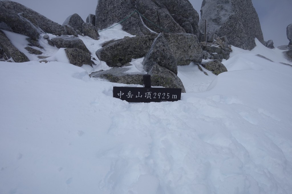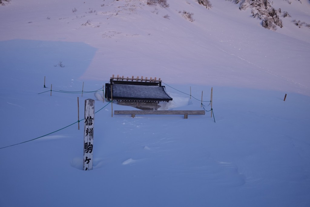 宝剣岳の頂上は祠も雪に埋まって、本当に小さいスペースです。