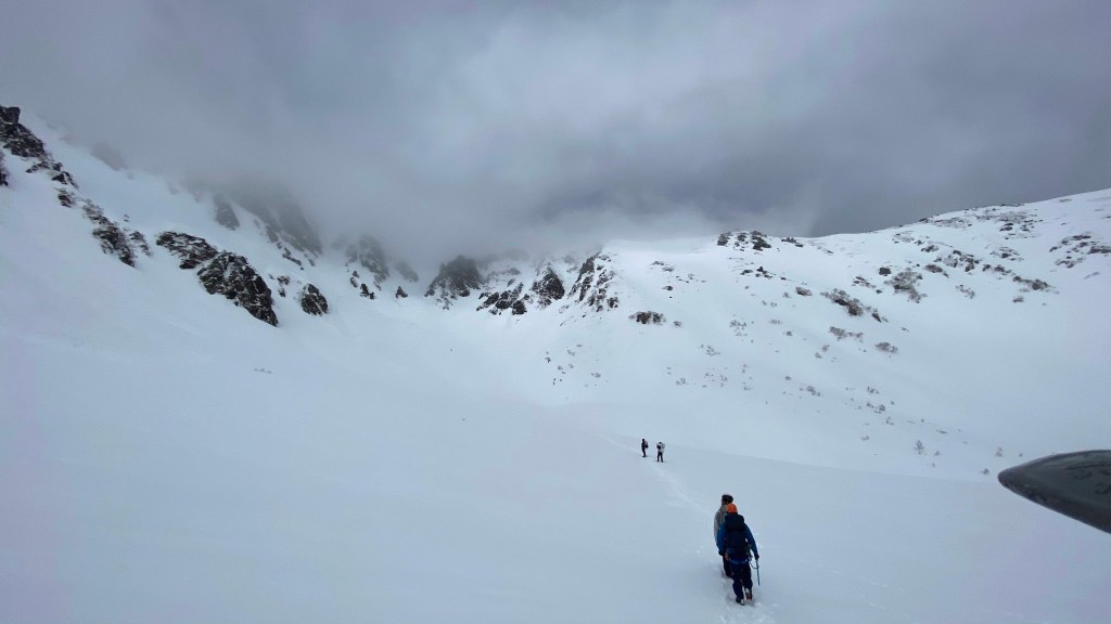 アイゼンでの岩登りを交えて稜線へ出ると、風が強まります。