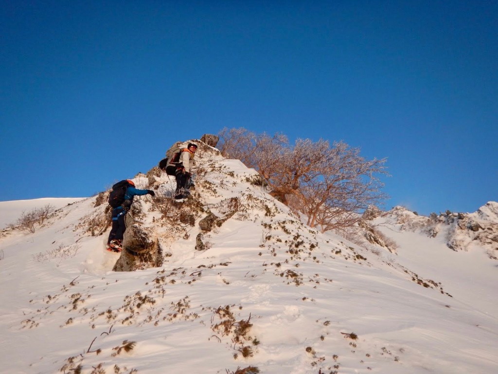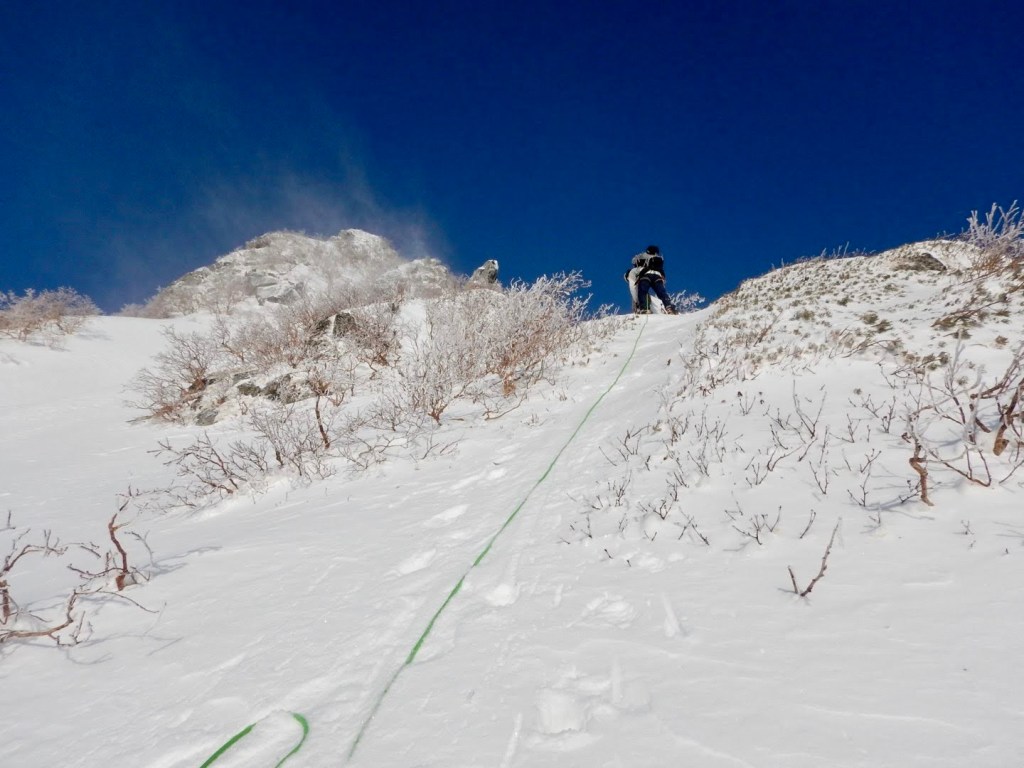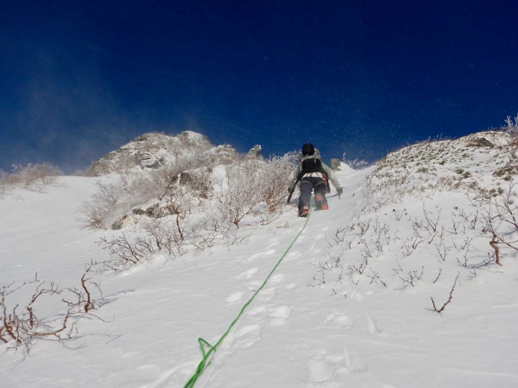 この時期は雪壁となっている箇所もあり、また稜線への抜け口は悪いので雪と岩の形状を判断しながらルートを引いていく必要があります。