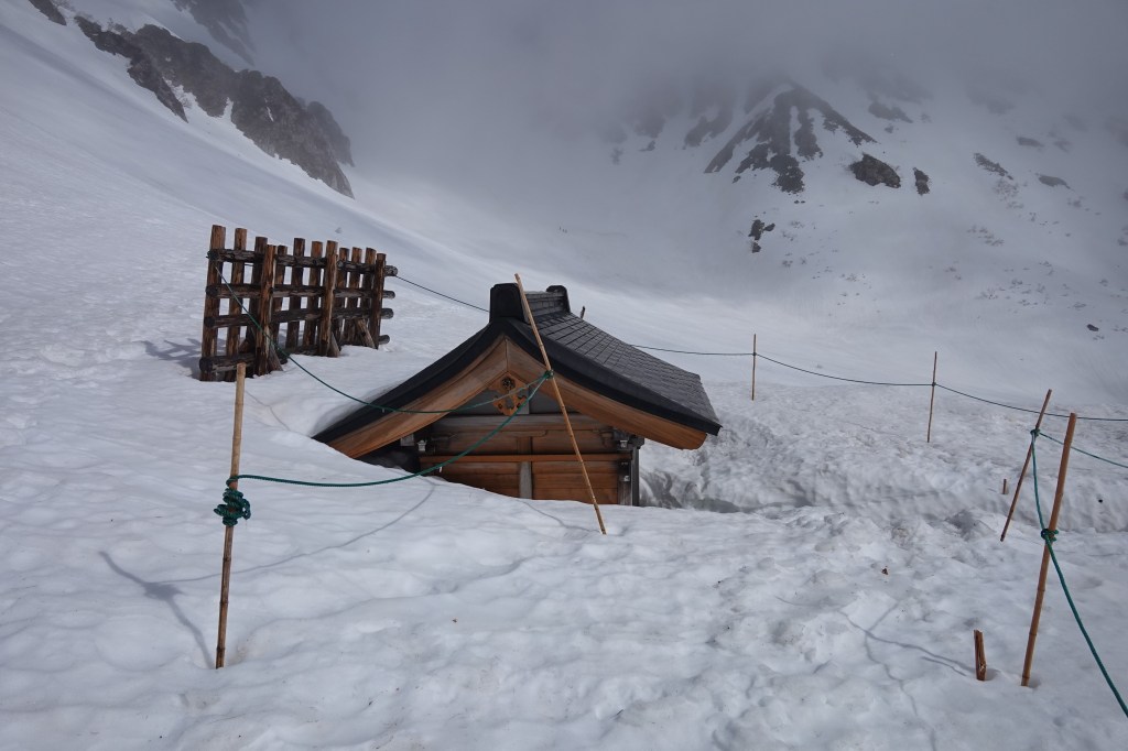 駒ヶ岳神社の祠の脇から、すっかり春の雪となり登りやすくなった雪稜に取り付きます。