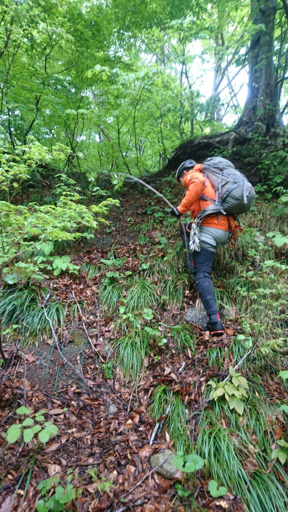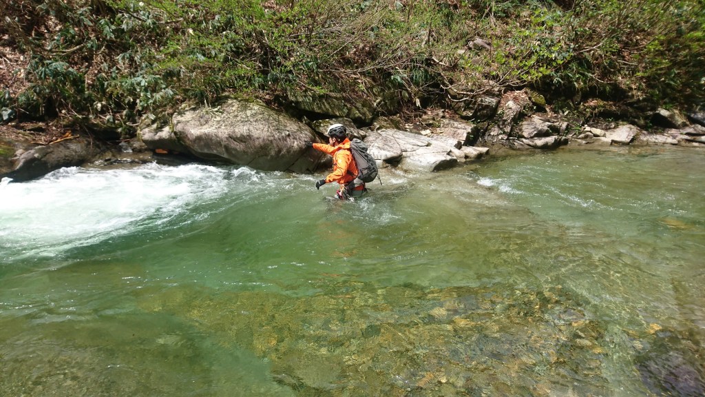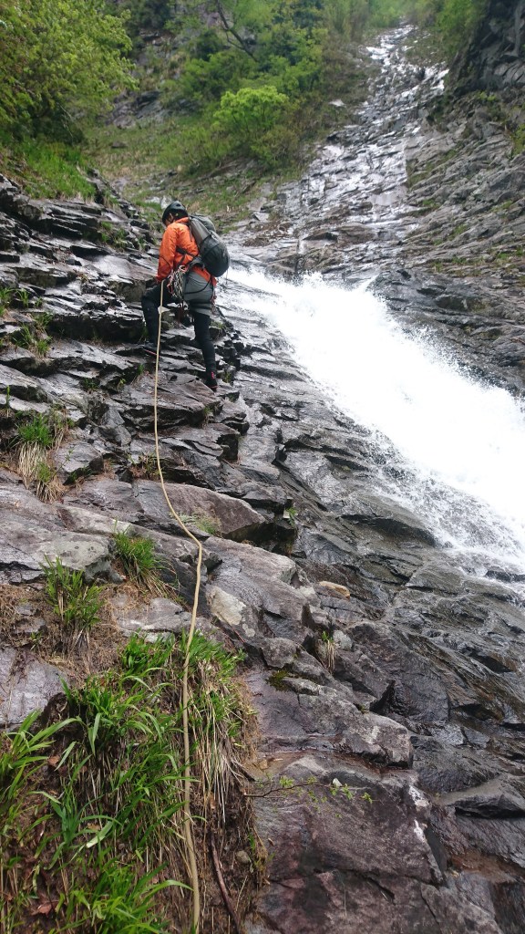 簡単ですが逆走気味なので、右岸側をロープを出して登ります。