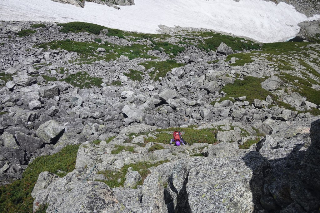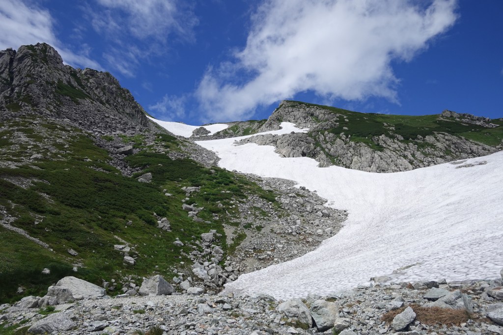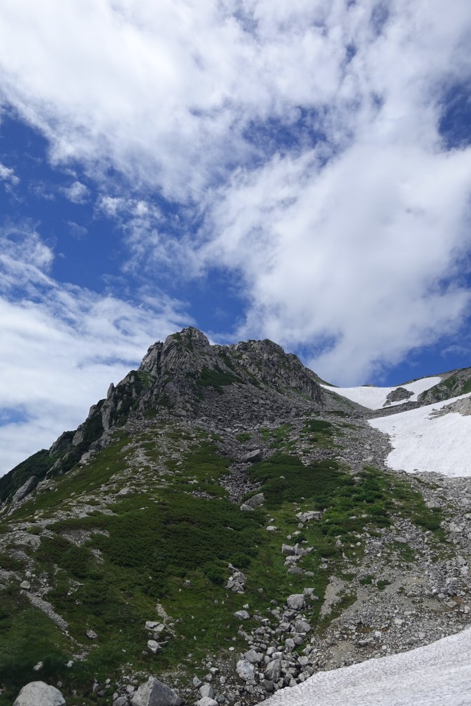 青空も広がり、カールの中のモレーンと池塘を縫って取り付きます。
