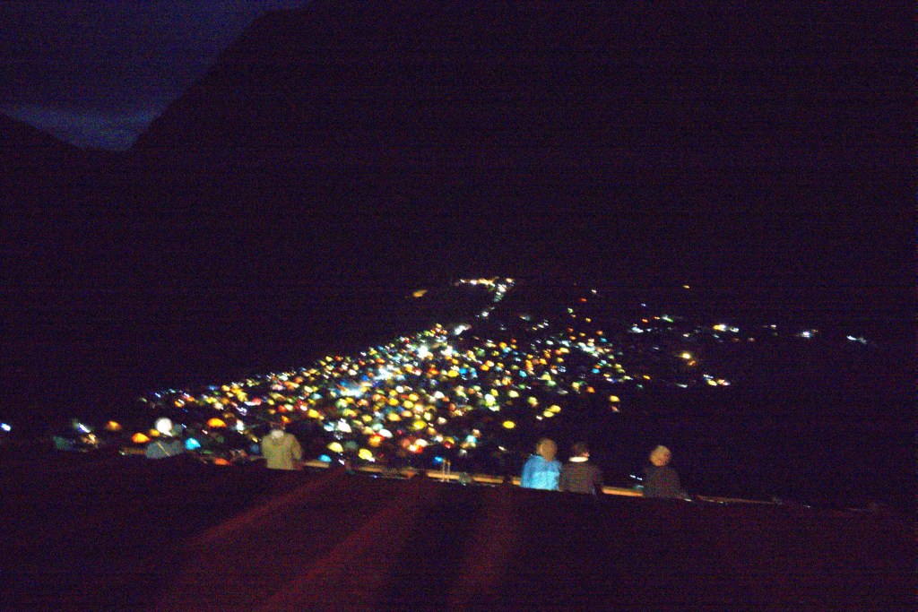 アタック日は暗いうちに出発。涸沢のテント村の灯が見事です。