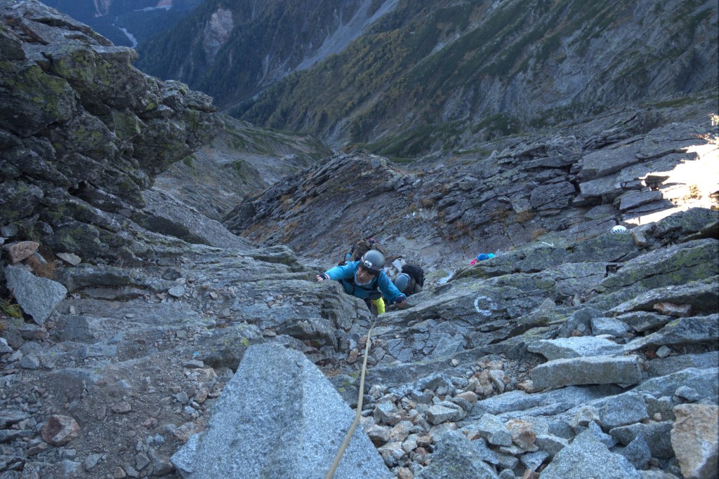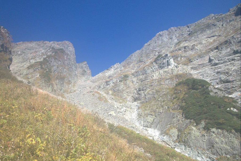 天狗のコルから天狗沢に降り、ガレた悪い岩場を行きます。