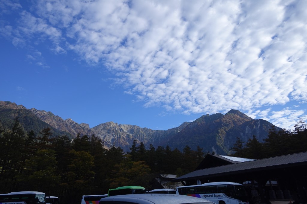上高地から見上げる穂高の空はすっかり秋の雲でしたが、気温は高くTシャツで十分。